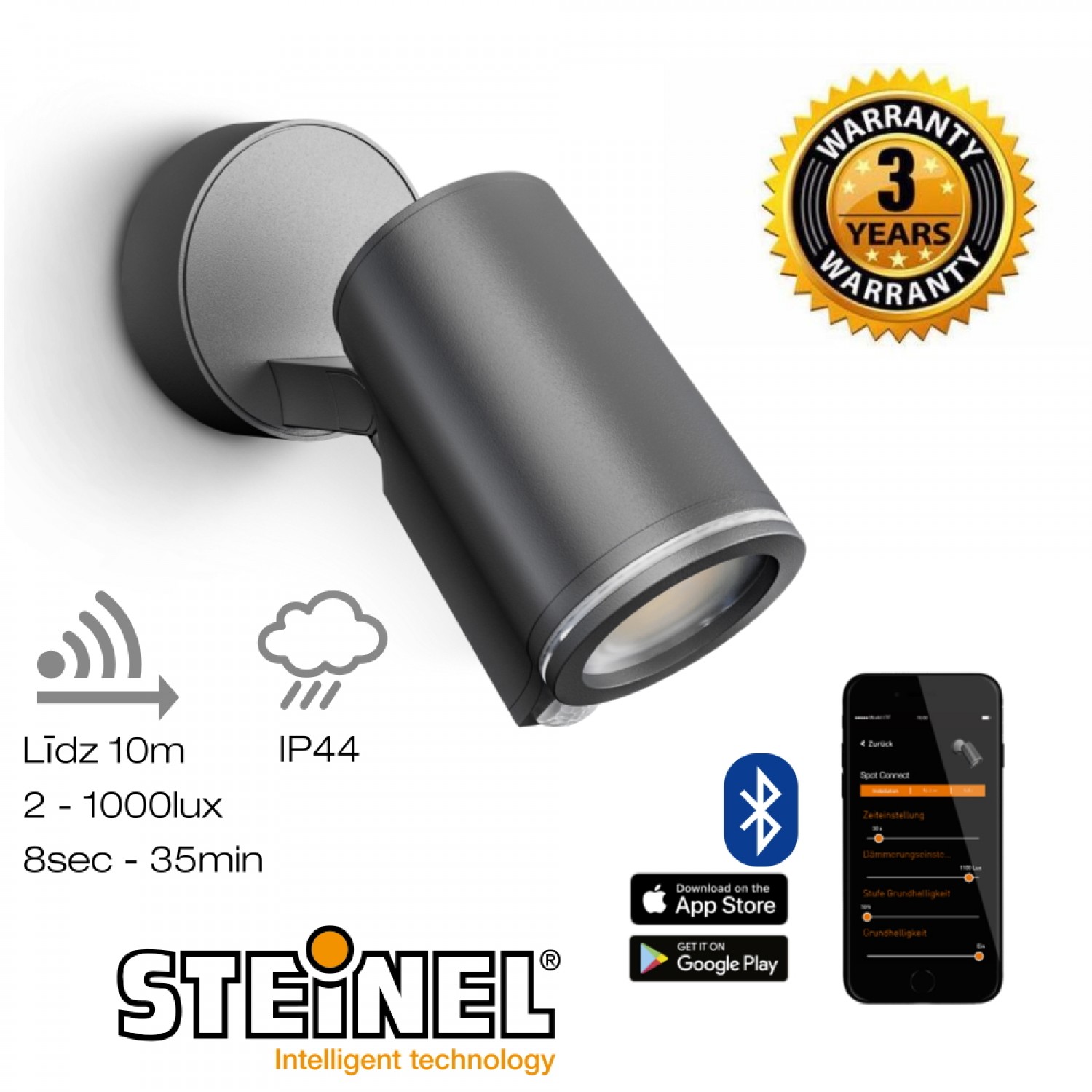 Jaunums! Steinel gaismeklis ONE SPOT CONNECT. Antracīta krāsas spot gaismeklis ar kustību sensoru, kurš ir vadāms ar bluetooth savienojumu no Jūsu tālruņa. Alumīnija korpuss, GU10 cokols ar max. 9W LED spuldzi. Komplektā iekļauta spilgtā 7W, 520lm, 3000K (ar silti balto gaismas toni) spuldzīte. Smalkāku sensoru aprakstu skatīt sadaļā "ATRIBŪTI".
