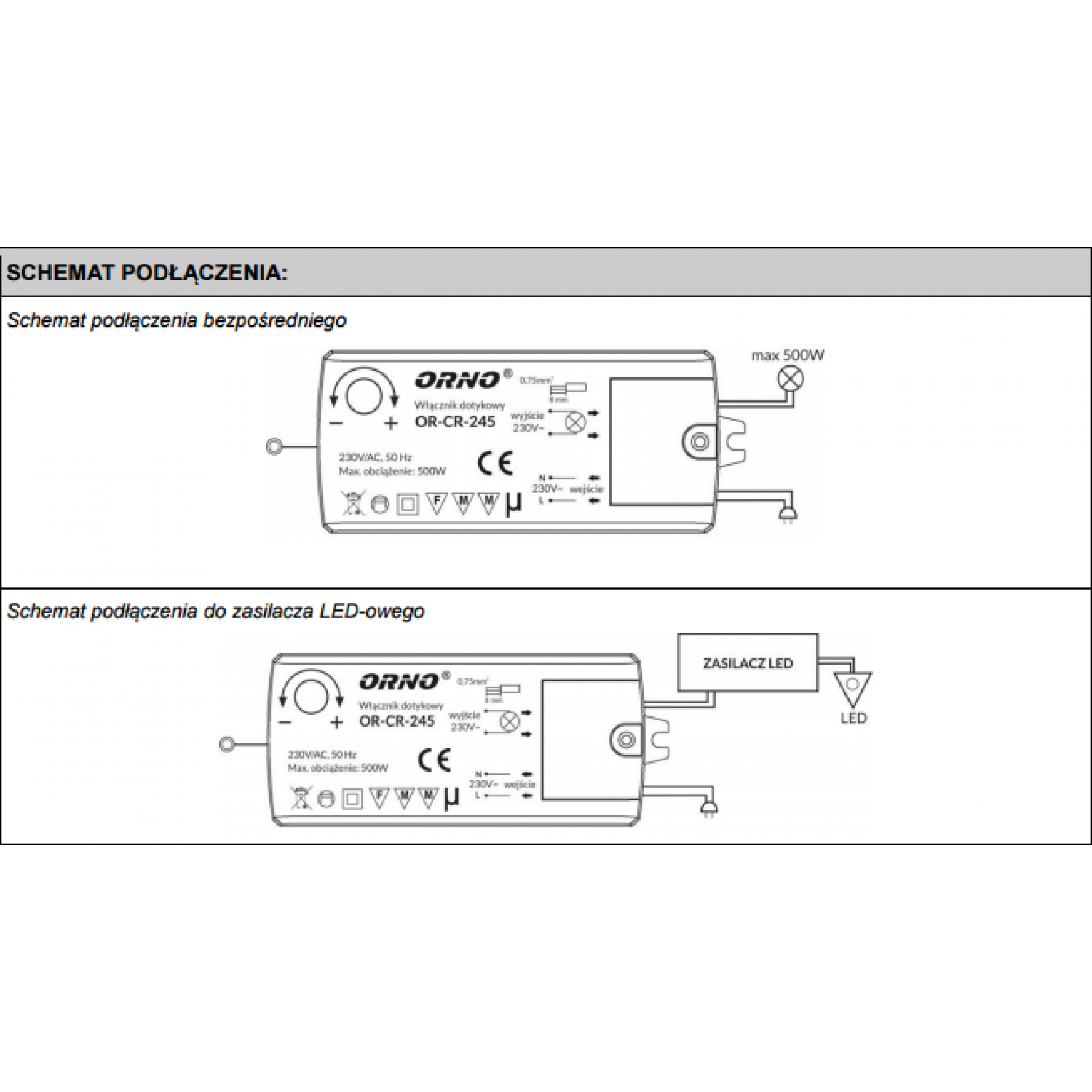 Skārienjūtīgs slēdzis ar pasīvu infrasarkano sensoru un iebūvētu sensoru ORNO OR-CR-245. Kabeļa garums ir 1.5 metri, kas padara iespējamu to pieslēgt pie durvju roktura, kas veidots no labi elektrību vadoša metāla. Paredzēts lietošanai iekštelpās.