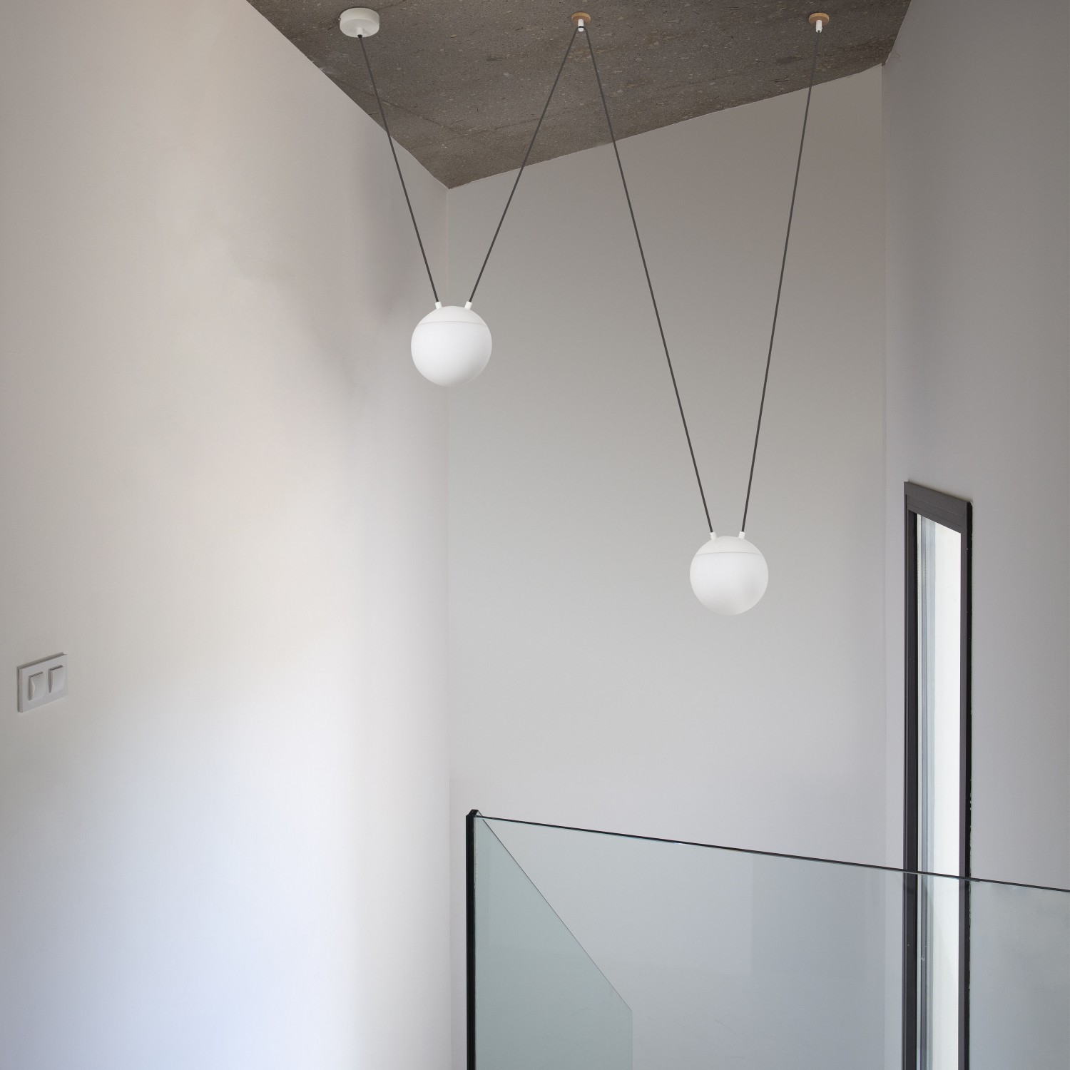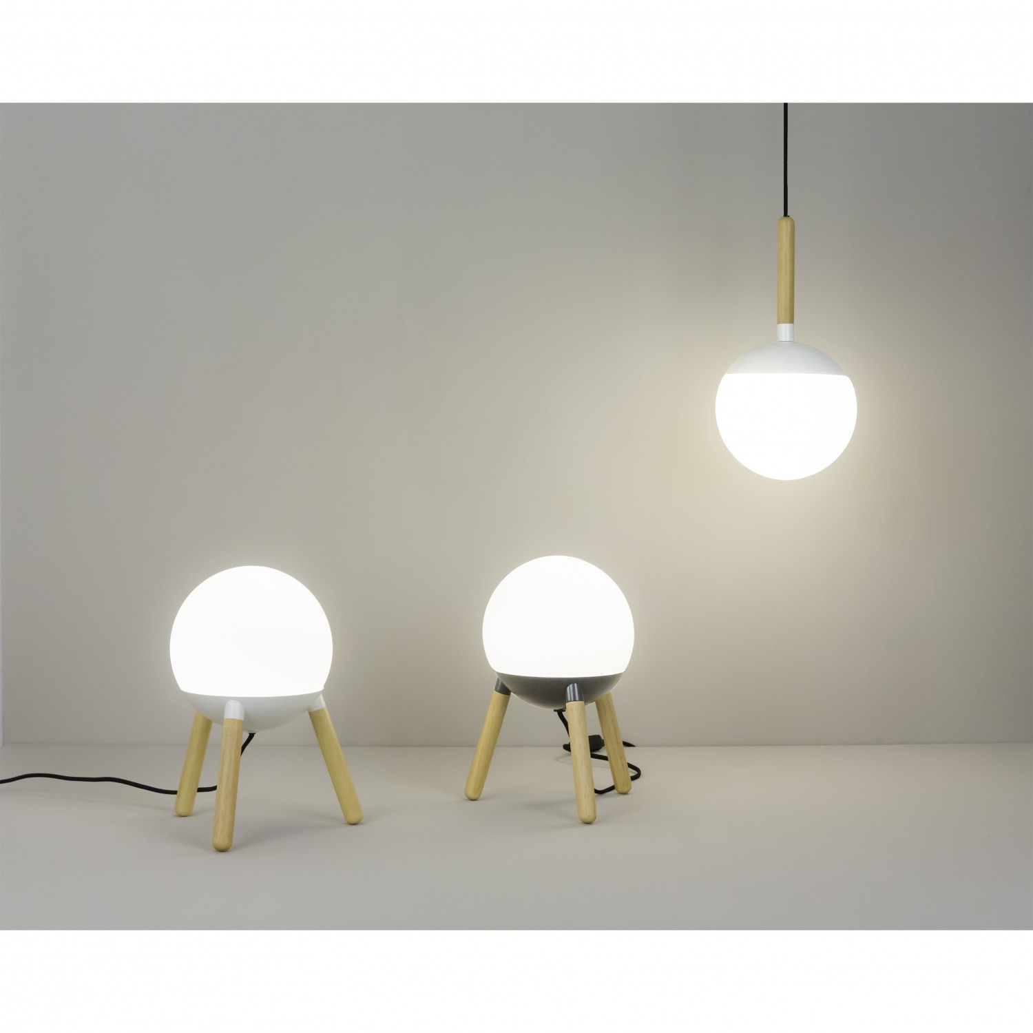 Moderna lustra, kas veidota no metāla, koka un opāla stikla. Gaismas avots ir 1 x E27 max. 20W spuldze, kas komplektā nav iekļauta.