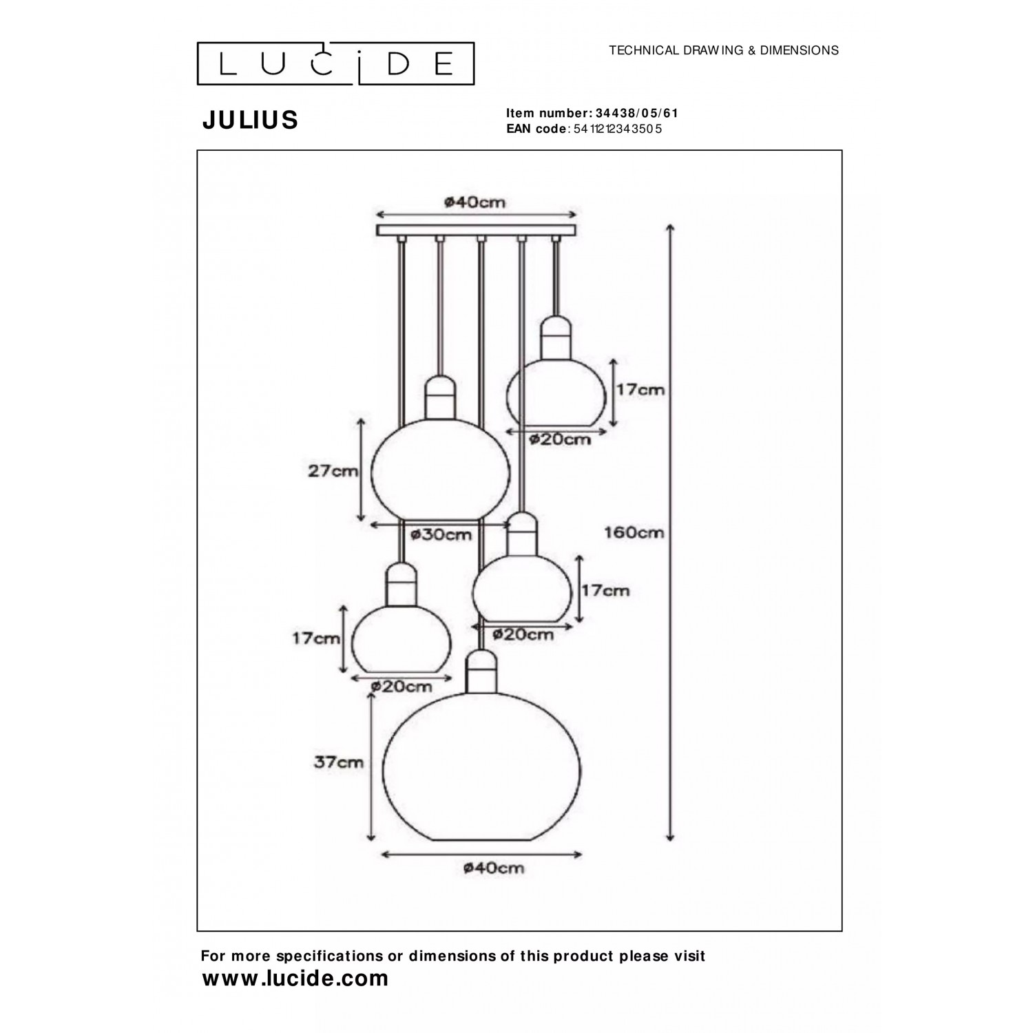 Griestu lampa JULIUS ir lielisks interjera papildinājums. Tā īpašais dizains piešķir mazliet antīku noskaņu interjeram, taču neaizmirstot par lampas moderno raksturu. Lampas dizains sastāv no piecām stikla bumbām, kas iekārtas auduma auklā un dažādos augstumos piestiprinātas pie metāla plāksnes. Stikla bumbu augstumus ir iespējams regulēt, tajās ir iespējams ievietot LED spuldzes, kā arī lampu ir iespējams savienot ar gaismas regulatoru / reostatu, ar kura palīdzību regulējot gaismas spilgtumu būs iespējams telpā radīt nepieciešamo noskaņu.
