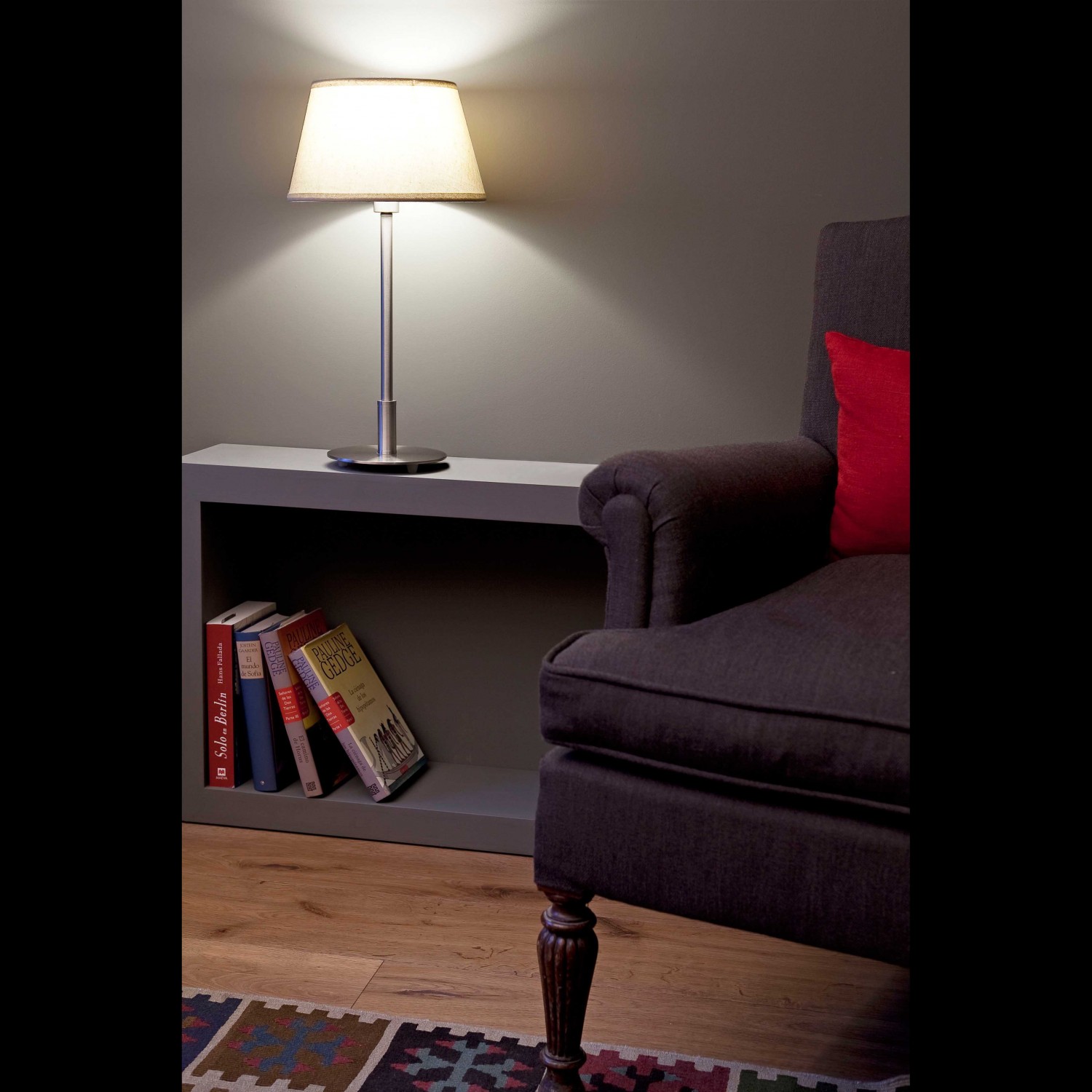 Moderna galda lampa priekš iekštelpu apgaismošanas, kas veidota no metāla ar tekstilu. Gaismas avots 1 X E14 60W spuldze, kas komplektā nav iekļauta.