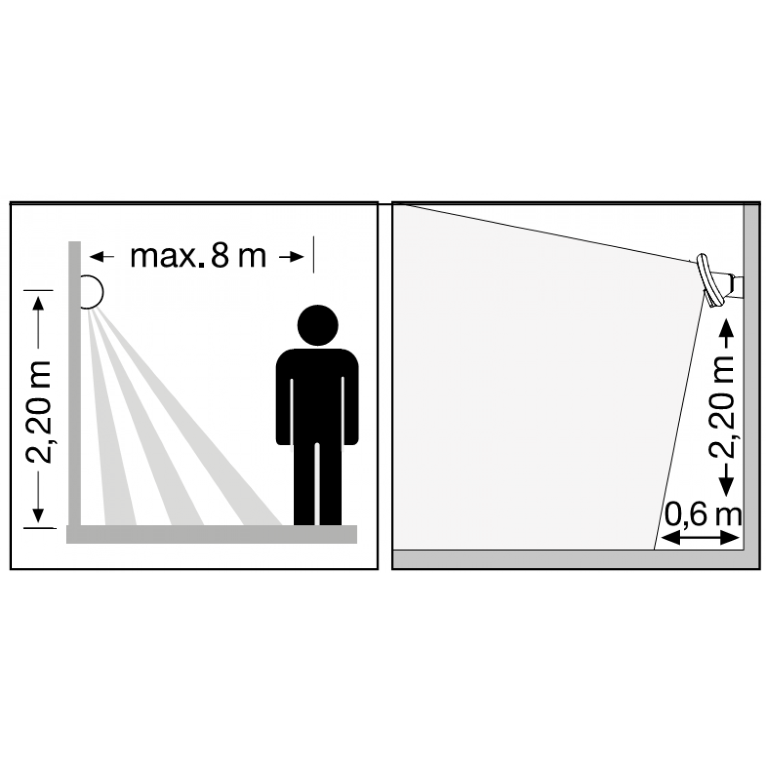 Infrasarkanais sensors uztver kustības līdz pat 8 metru attālumā, 160° leņķī, iededzot 9.3W LED gaismu (3000K) ar 862 lūmenu gaismas plūsmu jau pēc aizsegstikla. Sensoru iespējams pagriezt horizontāli +/-30° robežās.