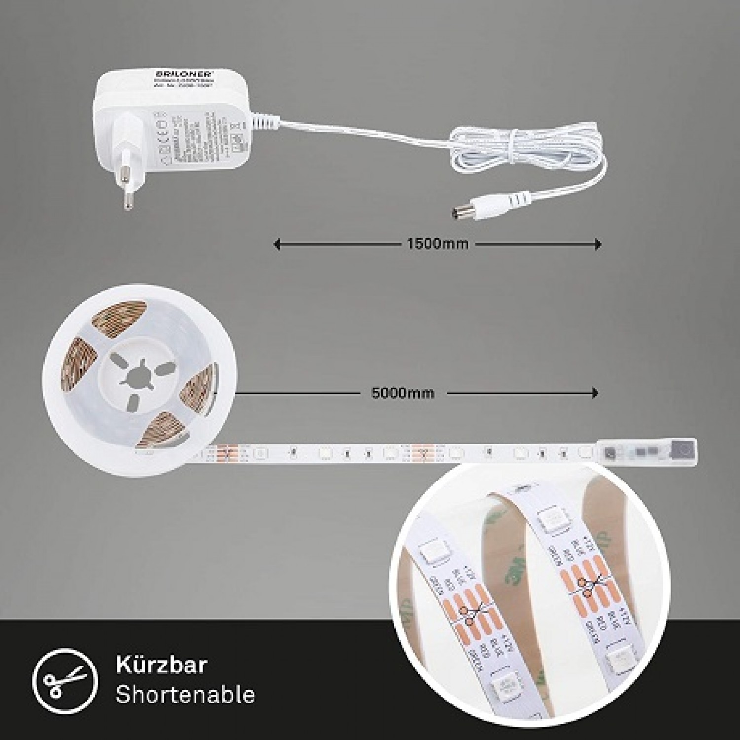 5m garš RGB LED slokšņu komplekts ar 30 diodēm/metrā, IP20 aizsardzības klasi. Komplektā ietilps 5 metri pašlīmējoša RGB LED lenta, barošanas bloks un kontrolieris ar pulti. LED sloksne var saīsināt to griežot norādītajās vietās, bet to nevar pagarināt bez speciālām ierīcēm. Kopā sloksnē ir 150 gaismu diodes.