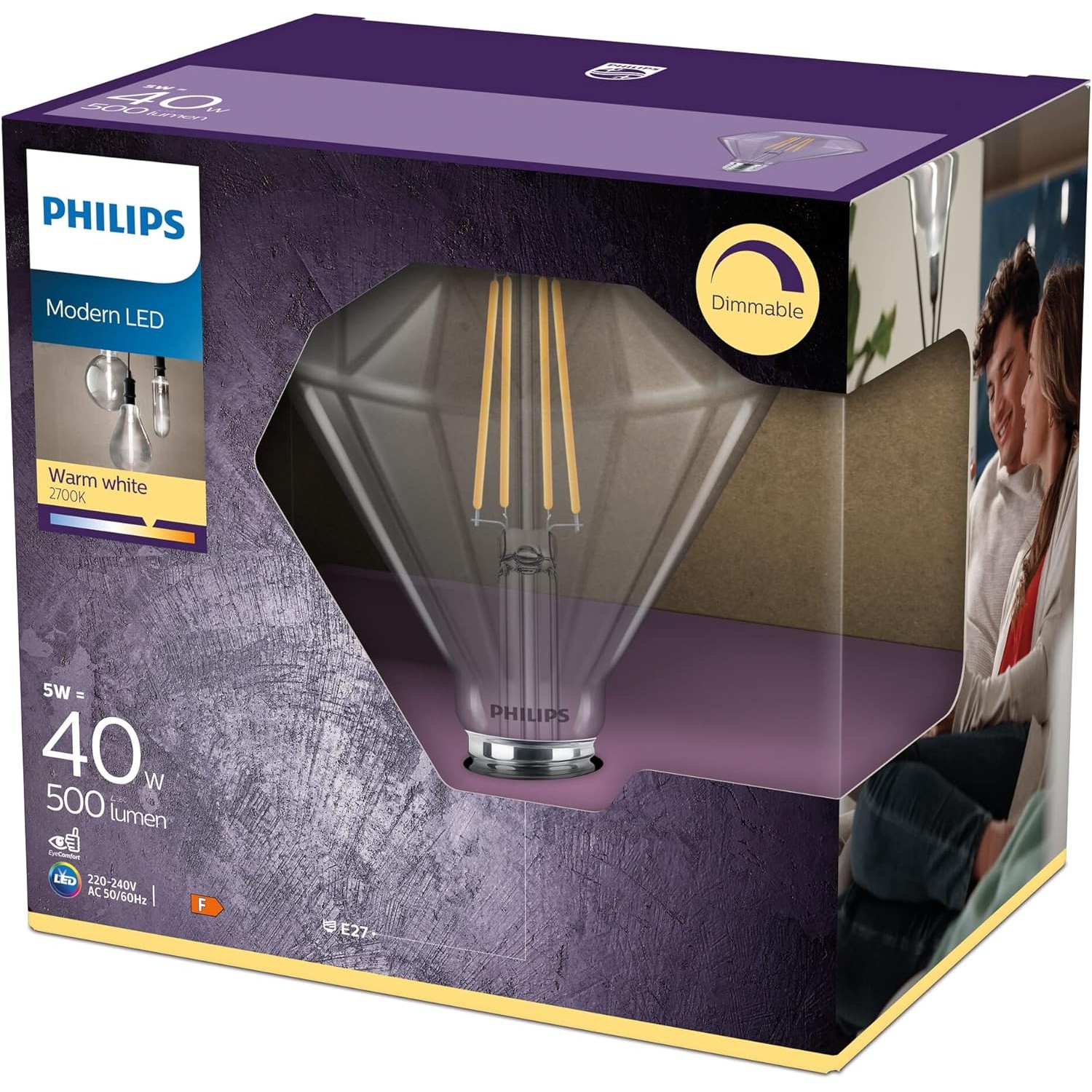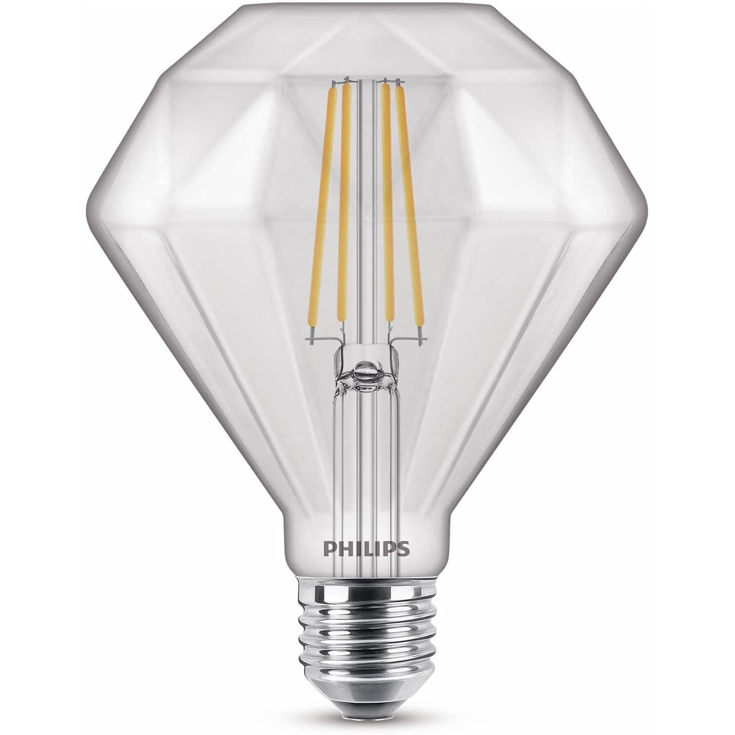 Philips LED Dimanta formas E27 spuldze nodrošina skaistu un dekoratīvu silti baltu gaismu (2700K) ar 500 lm gaismas plūsmu, padarot to ideāli piemērotu dažādiem interjera apgaismojuma risinājumiem. Caurspīdīgais stikls un dimanta dizains piešķir tai elegantu un klasisku izskatu, kas lieliski papildina gan vintage, gan modernā stila interjerus. Šī LED spuldze sniedz būtisku enerģijas ietaupījumu - ar 5W jaudu tā nodrošina ekvivalentu gaismas plūsmu 40W klasiskai kvēlspuldze, ietaupot līdz 90% enerģijas salīdzinājumā ar tradicionālajām kvēlspuldzēm. Pateicoties dimmējamai funkcijai un augstam krāsu atveides indeksam (CRI 80), tā ir lieliska izvēle, lai radītu pielāgojamu atmosfēru un mājīgu apgaismojumu. Ar kalpošanas laiku līdz 15,000 stundām un izturību ar 20,000 ieslēgšanas cikliem, tā ir uzticams un ilgmūžīgs apgaismojuma risinājums.