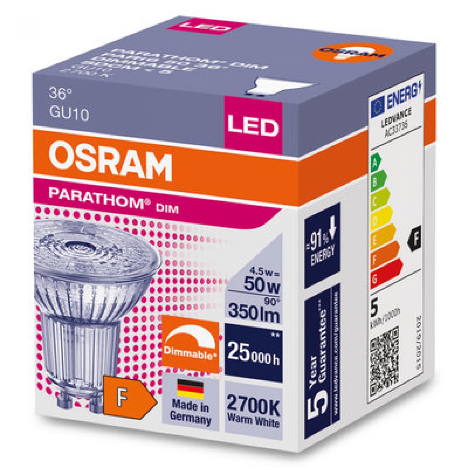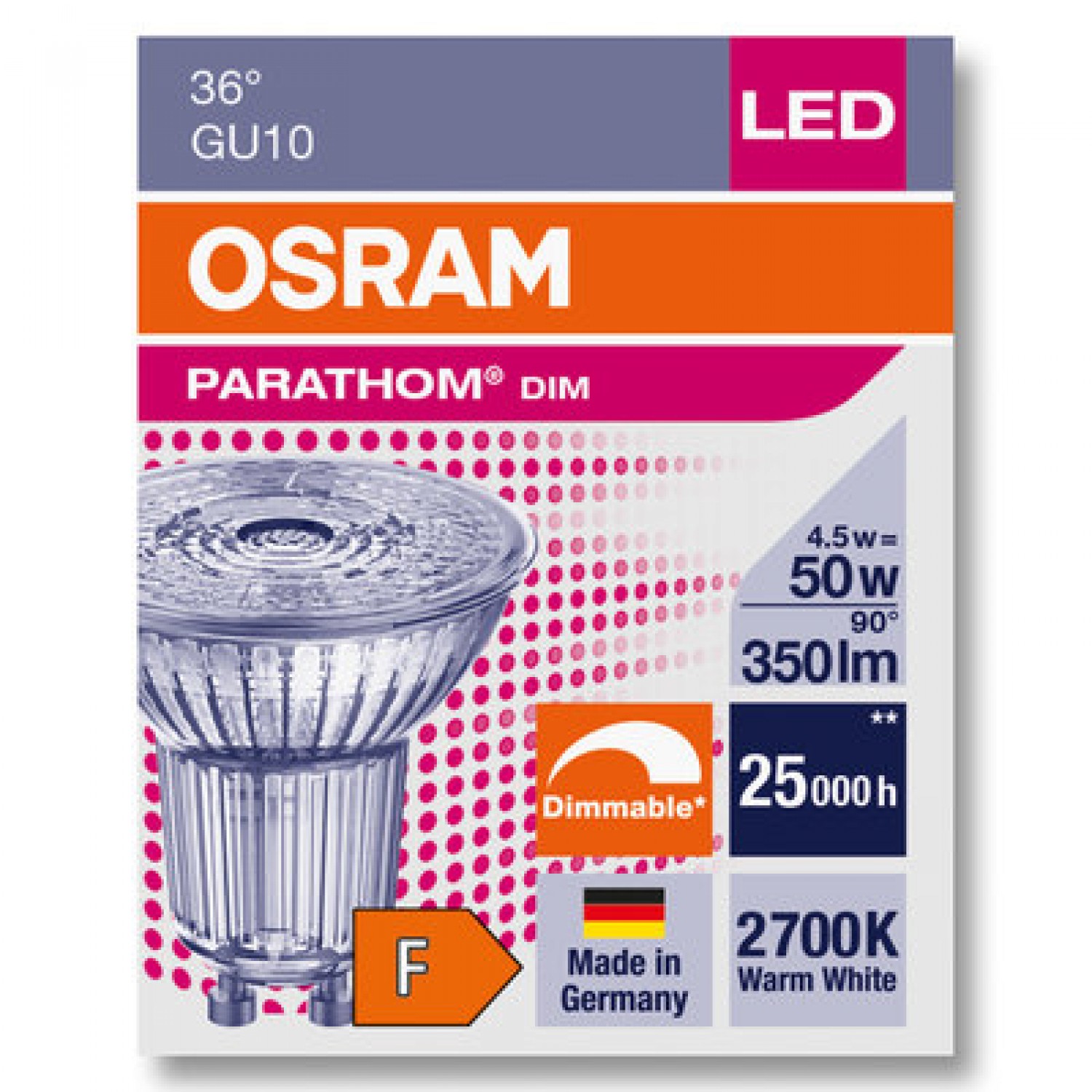 Dimmējama (regulējama ar reostatu) 4.5W GU10 LED spuldze 927 ar 350Lm gaismas spilgtumu paredzēts aizvietot 50W kvēldiega spuldzi. 2700K Silti baltais gaismas tonis rada mājīgu atmosfēru. Gaismas stara leņķis 36º